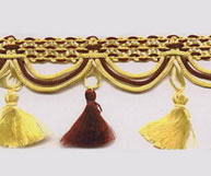 Decorative tassel trim featuring yellow and brown colors, ideal for enhancing home decor and upholstery projects.